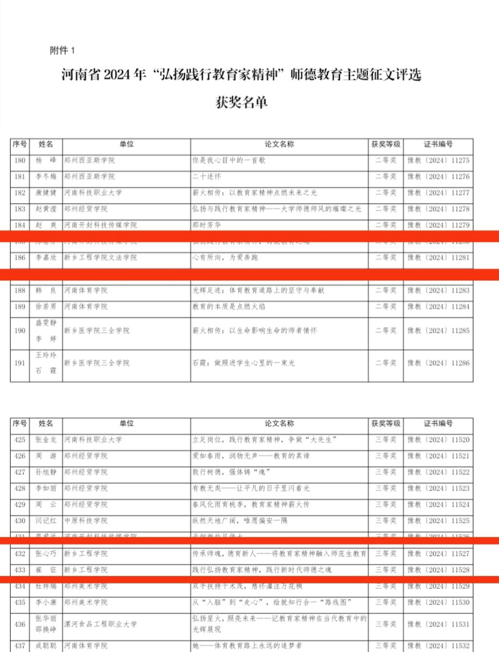 近日,河南省教育厅办公室公布了2024年“弘扬践行教育家精神”师德主题教育征文、演讲比赛评选结果,我院教师李嘉欣获省级征文二等奖,张心巧、崔征获省级征文三等奖。