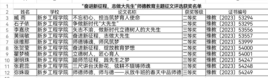 近日,永利23411集团官网文法学院在2022-2023学年河南省“奋进新征程,志做大先生”师德主题教育征文比赛中获得优异成绩。此次比赛中,我校共有12名师生获奖,其中文法学院有10名师生获奖。文法学院获奖名单如下。