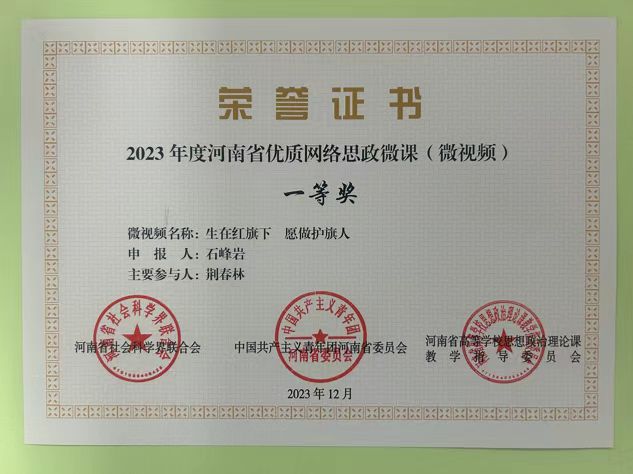 为深入学习贯彻习近平新时代中国特色社会主义思想,用党的二十大精神武装青年,我院学生积极参加由河南省社科联、共青团河南省委、河南省高校思想政治理论课教学指导委员会共同组织的2023年度河南省优质网络思政微课(微视频)征集活动,经过大赛网评及决赛的激烈角逐,由我院朱青老师指导,新闻学专业石峰岩和荆春林同学申报的作品——《生在红旗下 愿做护旗人》荣获2023年度河南省优质网络思政微课一等奖。