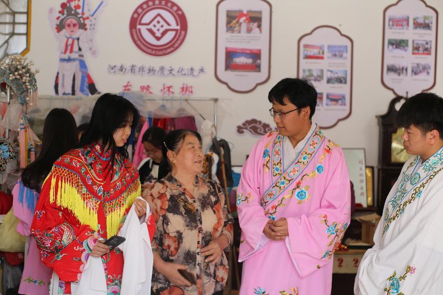 表演结束,同学们在老艺人的悉心指导下,学习了梆子、板胡、锣、鼓等怀梆乐器的演奏方法,还穿上传统戏服,学习哼小车戏曲中的经典动作。在沉浸式体验中,学生们深刻感受到了怀梆戏曲深厚的文化底蕴和独特魅力,他们纷纷感概:“亲手触摸这些历经百年的技艺,才真正明白“坚守”的弥足珍贵。
