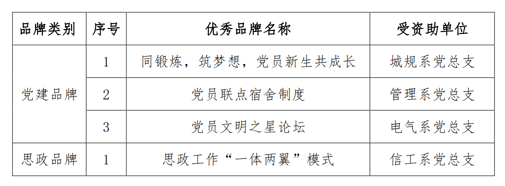 根据我院《关于开展党建品牌、思想政治工作品牌培育工程的通知》(院党字〔2016〕15号)相关要求,各党总支(直属党支部)结合本单位工作特点和实际,认真总结党建工作和思想政治工作特色,并积极申报。经各党总支(直属党支部)申报,评审小组评审和党委组宣部对申报材料进行综合审阅的基础上,报学院党委审批,研究确定优秀党建品牌3个、优秀思想政治工作品牌1个(见附件1)。院党委将对评选出的优秀品牌给予2000元的建设资助,用于进一步丰富品牌的内涵,完善机制,细化措施,推动品牌创建持续深入开展。对2017年实施效果优秀品牌(见附件2)追加1000元经费支持。