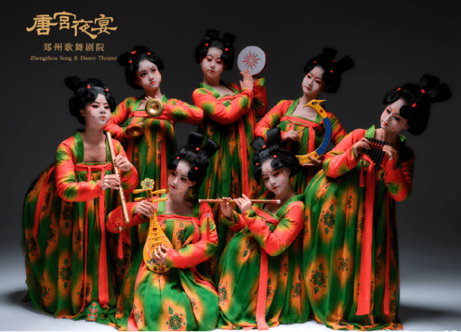 演员的整体造型来源于唐三彩的舞乐人俑,她们每个人的舞蹈动作都经过了精心的设计,不仅参考了众多出土的舞乐人俑的姿态,还借鉴了《韩熙载夜宴图》等大唐名画中舞乐歌姬的形象。