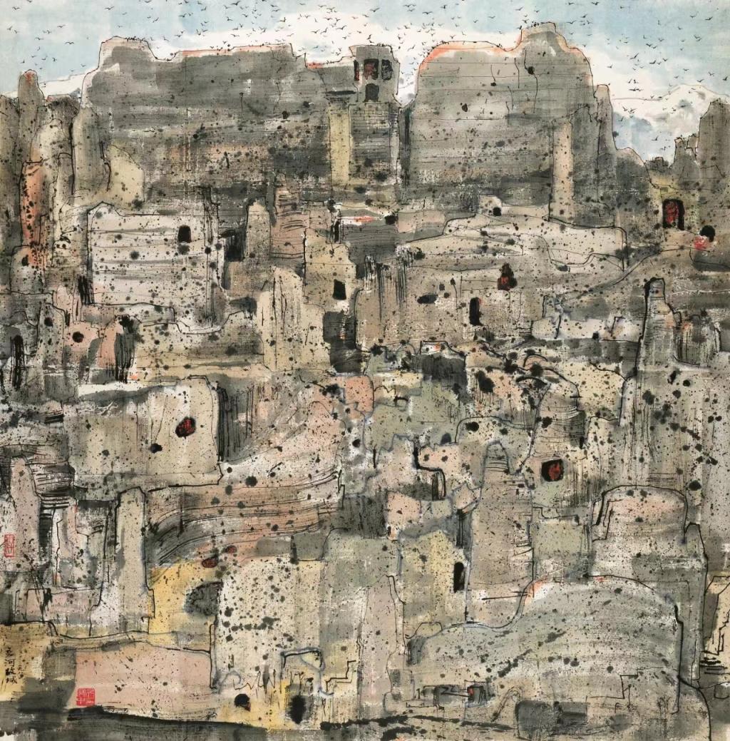 《交河故城》并非画家对真实景象的捕捉,而是现实投影到心灵过滤后的艺术再创造,被倾注了无限浪漫的诗意情怀与强烈的情感表达。画面以丰富的灰色调、层层叠加的结构勾勒出交河故城的残垣断壁,又用浓淡干湿的墨点与构图上方些许天空中的鸦群,反衬古堡的凄凉。