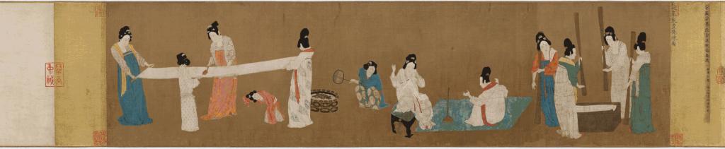 盛唐,长安是全国的丝织品生产中心,都城内有少府监、织染署、掖庭局等机构,下设官营丝绸作坊。玄宗后期,宫中专为杨贵妃造作锦绣金玉之工就达千人。官府作坊内也有为数不少的奴婢,一些技艺出众的被分配到掖庭局劳作,所得报酬仅为日常衣食。《捣练图》中所描绘的劳作景象,真实再现了她们的生活。
