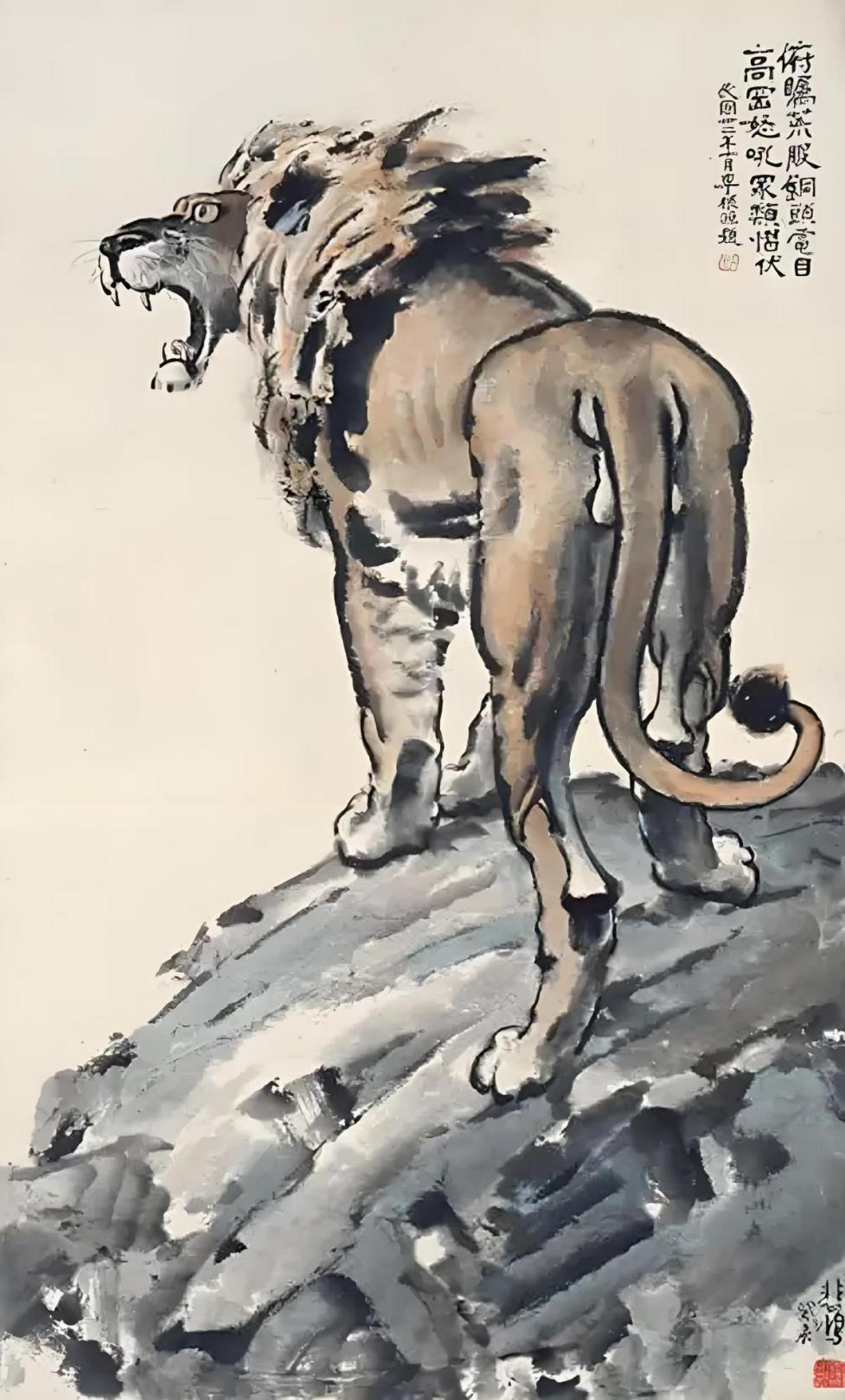 该作品是徐悲鸿在1941年所作,此时的中国正处于抗日战争的艰难阶段,全国上下都在为民族存亡而奋斗,中国社会动荡不安、民族危机深重。画中的狮子是中华民族的象征,其威猛、雄壮和不屈不挠的精神,正是中华民族在面对外敌入侵和艰难困苦时所应具备的品质。徐悲鸿通过描绘狮子的怒吼,表达了对民族觉醒和奋起反抗的强烈呼唤。画面中,雄狮立于右上角,全身朝向画心扭头怒吼,营造出强烈的动态感。画面大面积的留白使画面产生不稳定感,同时又为狮子提供了广阔而富有张力的舞台,使整个画面显得既紧凑又大气。徐悲鸿的《高岗狮吼》不仅是一幅艺术价值极高的国画作品,更是其爱国情怀和坚定信念的深刻体现。通过狮子的形象,徐悲鸿传达了对民族觉醒和奋起反抗的强烈呼唤,成为激励中华民族不屈不挠、奋发向前的精神象征。