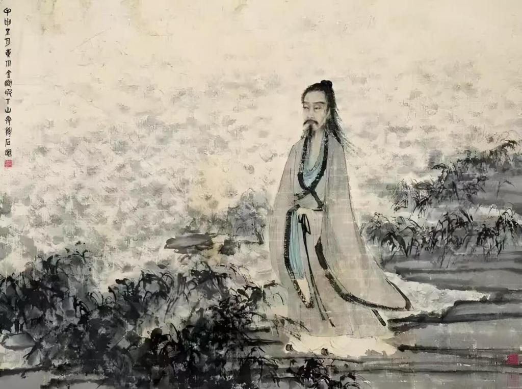 《屈子行吟图》创作于1942年,正值抗日战争时期,民众在抗日救亡反侵略的战争中民族意识逐渐觉醒,驱除鞑虏恢复中华的决心日渐强烈坚决,而屈原作为战国时期的爱国英雄早已深入人心,是我们中国历史上的爱国典范和象征。故而傅抱石借笔下屈原的相关人物形象表达了对爱国英雄屈原的崇敬和热爱,同时也抒发了画家对民族和国家的深切热爱及责任之心。在傅抱石的心灵深处与这些爱国诗人有着同样的家国坎坷经历,他视古人为知己,抒发胸中志趣情怀,将自己的忧国忧民之情传递在笔墨纸间。