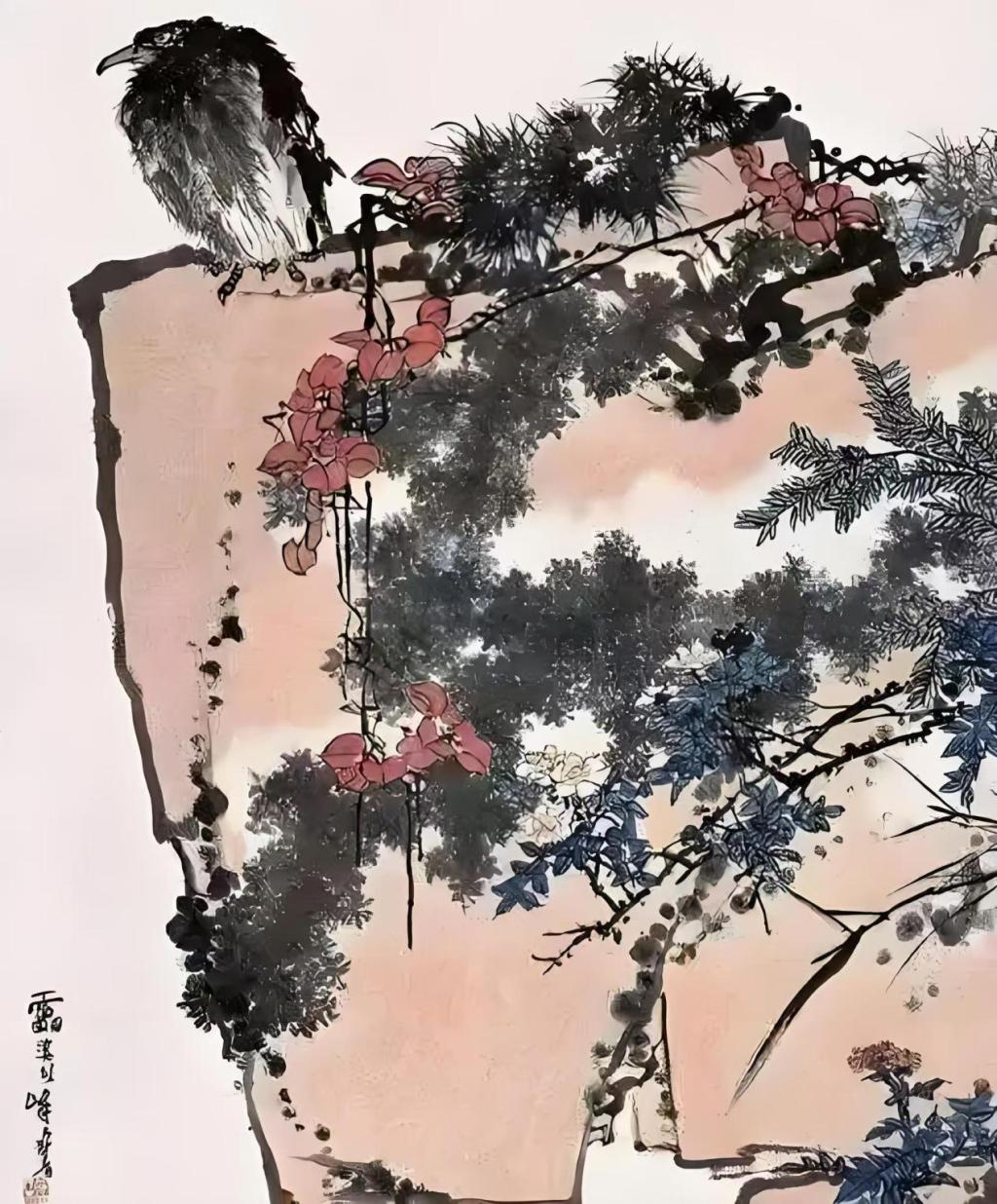 潘天寿在画中运用了传统中国画的笔墨技法,线条刚劲有力,墨色浓淡相宜,尤其是对鹰的刻画,既注重形似,又追求神韵,展现了画家对自然的深刻观察与艺术提炼。山花的点缀则为画面增添了一抹柔美与生机,使整幅作品在雄浑中不失细腻。这幅画不仅展现了潘天寿对传统中国画的继承与创新,也体现了他对自然与生命的深刻感悟。通过鹰、石、山花的组合,潘天寿表达了对坚韧不拔精神的赞颂,以及对自然和谐之美的追求。《鹰石山花图》是中国现代绘画史上的经典之作,具有极高的艺术价值与文化意义。