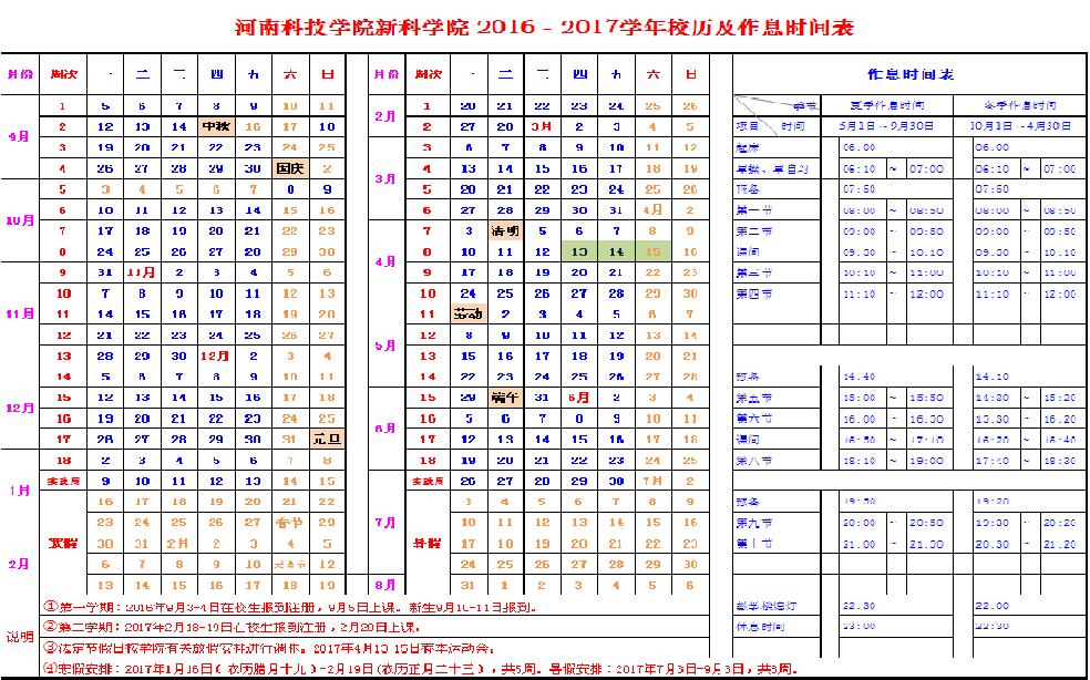校历:新科学院2016-2017学年校历
