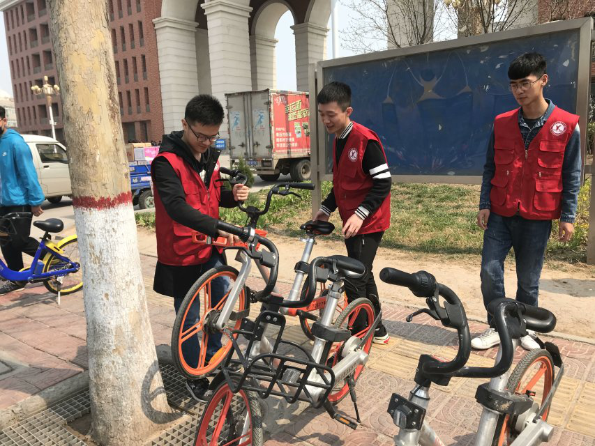 3月19日中午,电气系志愿者们发起整理校内外自行车活动,他们来到宿舍楼前的自行车停放点以及校外的共享单车停放区域,整理搁置凌乱的自行车,并对停车、取车的同学进行引导与监督,经过志愿者们的共同努力,一排排整齐有序的自行车看起来让人赏心悦目。