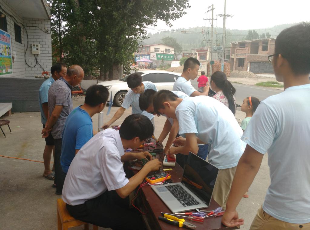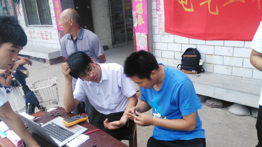 在到达白马峪村后,同学们迅速的布置好维修点,摆放好桌子和工具,开始为村民们义务维修家电。村民们在得知家电维修服务队的到来后纷纷带上损坏家电聚集到服务台旁。队员们详细询问着每一件被损坏家电的情况,仔细地分析原因并认真地修理起来。随着被送来的家电越来越多队员们开始忙碌起来,起初村民看着队员们脸上露出半信半疑的表情,这帮小伙子到底能不能把家电修好,但看着队员们娴熟的技巧,他们很快地打消了疑虑。当他们抱走一件件修好的电器时,他们竖起的大拇指和满脸的笑容是对我们最大的鼓励。
