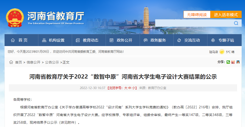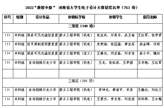 近日,根据《河南省教育厅关于2022“数智中原”河南省大学生电子设计大赛结果的公示》文件内容,我院和信息工程学院学子在2022“数智中原”河南省大学生电子设计大赛中荣获二等奖4项,三等奖2项。