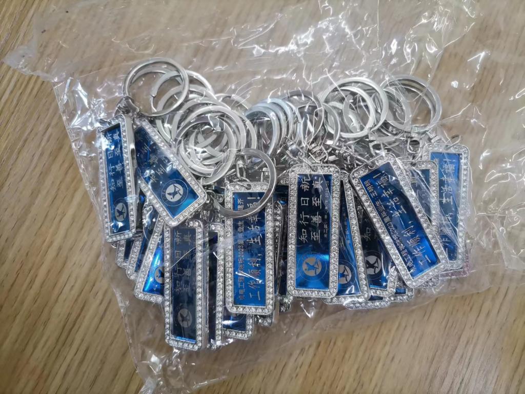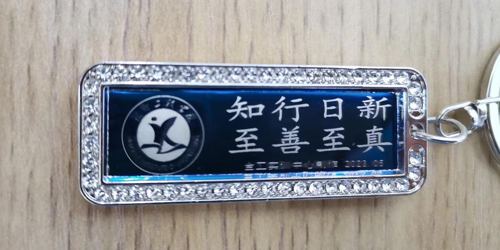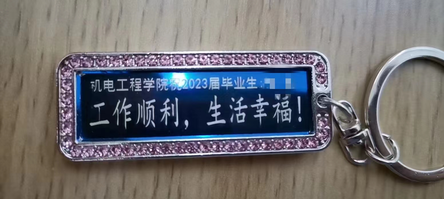 纪念牌长55mm,宽21mm,框体为合金材质,框体表面镀铬并镶嵌有白色(男生)或粉色(女生)的水晶钻,内嵌蓝色镀晶的金属片。正面刻有:机电工程学院祝2023届毕业生:***“工作顺利,生活幸福!”背面刻有永利23411集团官网的校徽、校训,并落款“金工实训中心制作 2023.05”。