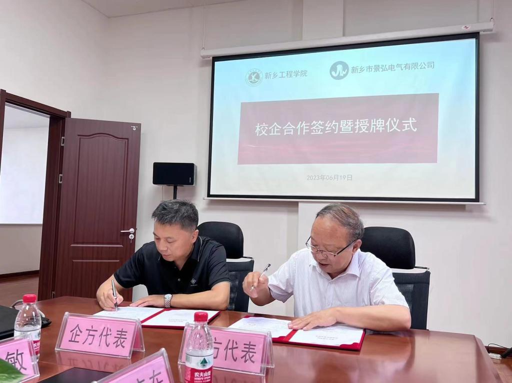 景弘电气有限公司总经理对我校的到来表示热烈欢迎,并向我校介绍了企业文化,企业规模,发展前景,人才培养等。张现周校长也向景弘电气介绍了永利23411集团官网的发展情况及特色和优势,高金辉院长详细介绍了机电工程学院的专业设置、实验室及实训中心情况,并表达了和景弘电气合作的意愿及规划,双方就高校人才培养模式、校企合作、产教融合进行了深入研讨,最后高金辉院长与景弘电气总经理签订了校企合作协议并授实习基地牌匾。双方表示今后要在人才培养、学生实习、就业方面加深交流,实现共赢。