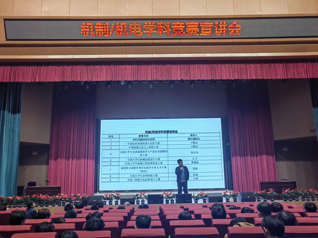 10月31日,机电工程学院在B3楼报告厅举办“机制/机电学科竞赛宣讲会”,本次宣讲会由机制教研室崔智勇主持,教学副院长廖志雄、教授解金榜、机制及机电教研室老师及大二、大三学生300余人参加了此次宣讲会。本次宣讲会旨在向学生宣传机械类竞赛、调动学生参加竞赛的热情。