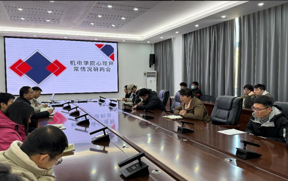 新学期开启,为全面掌握学生心理状况,2023年10 月 11日,机电工程学院在综合实验楼201召开心理异常研判会,机电工程学院党委副书记武庆东主持会议,各辅导员参会。