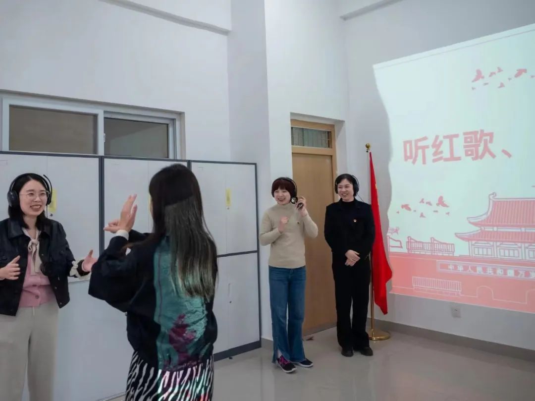 活动中,全体教师分组进行,各组排成一列,戴上播放音乐的耳机,由第一位教师记忆所需传递的红歌歌词,通过口型和肢体动作在有限时间内向下一位教师传递,以此类推,并由最后一位教师讲出所猜到的歌词,回答正确的教师们则一起品析本首歌曲背后的红色事迹及其历史意义。在此过程中,全体教师积极参与、配合默契,传递了《没有共产党就没有新中国》、《团结就是力量》、《歌唱祖国》、《社会主义好》等众多经典红色歌曲。