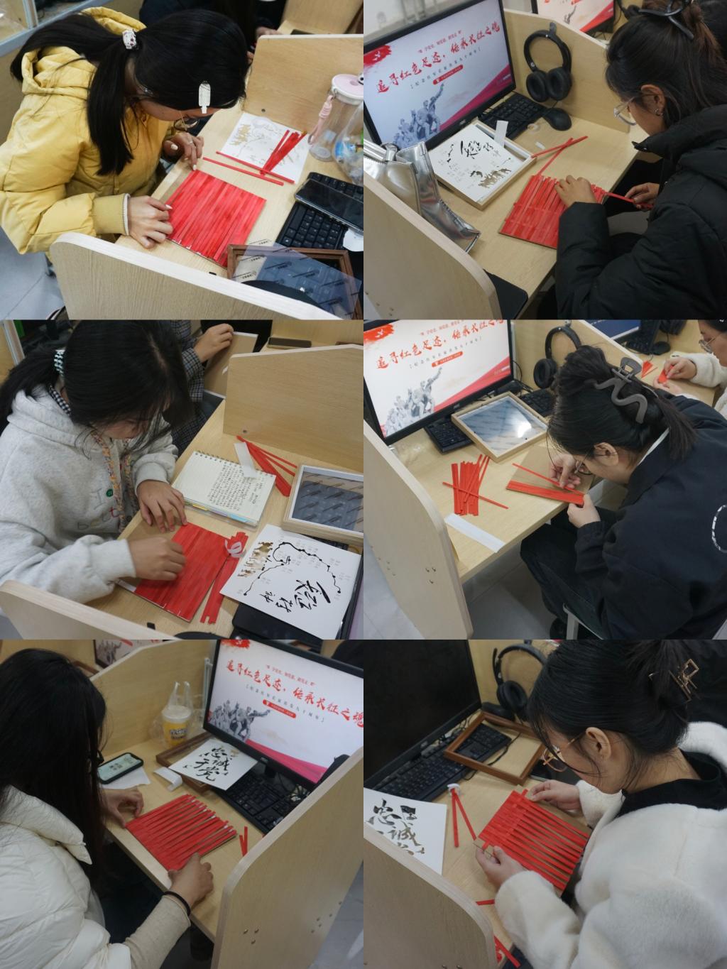 在长征故事分享结束后,为了让同学们能以更具创意和实践性的方式铭记长征精神,活动进入到了制作主题竹编画环节。同学们将对长征精神的理解融入到手中的竹编创作里,细细的竹条在同学们的精心编排下,逐渐呈现出长征路上的各种经典场景,饱含着对革命先辈的敬意,将长征之魂融入到这一幅幅独具匠心的竹编画作品中。通过亲手创作,同学们更加深刻地体会到长征精神的内涵,也用这种独特的方式铭记那段不可磨灭的历史。