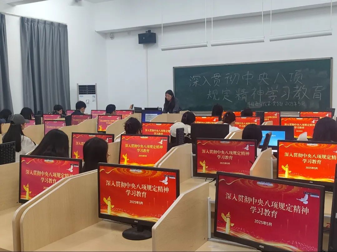 为深入贯彻落实中央八项规定精神,深化党的作风建设,外国语学院第一党支部于5月22日在第二教学楼语音室1组织开展“深入贯彻中央八项规定精神学习教育”主题党课。本次党课由支部书记殷可主持并宣讲,党支部全体学生党员参加。