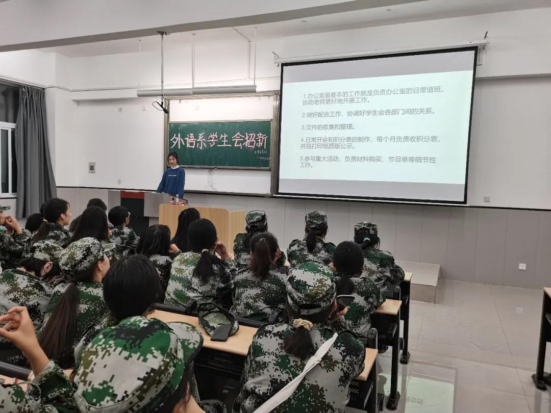 为了进一步充实外语系学生会的力量,促进学生会工作的顺利开展,更好地发挥学生会在工作中的桥梁和纽带作用。新科学院外语系于10月15日19:00在B2-307开展了学生会招新动员大会。此次会议由学生会主席计冰冰主持,外语系学生会全体成员及20级全体学生与会。