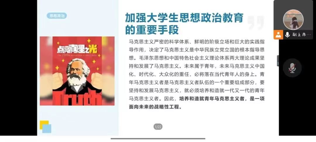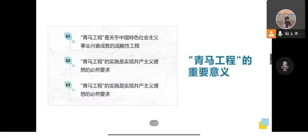 为加强青年学生对马克思主义理论的理解,增强同学们的爱党爱国情感,外国语学院于11月1日中午12:40通过腾讯会议平台开展青马工程培训。本次培训由学生会副主席李梦娜主持,大一至大三各班班长、团支书、助理团及学生会全体成员参会。