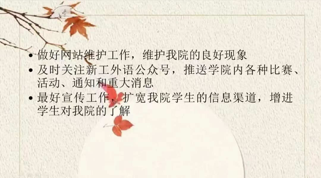 为提升学生干部的综合素质,加强学生干部队伍建设,强化学生干部的责任感,外国语学院团总支学生会于11月15日中午12:10在腾讯会议平台开展学生干部培训。本次培训由宣传部副部长杨田吉主持,大一至大三各班班长、团支书、助理团及学生会全体成员参会。