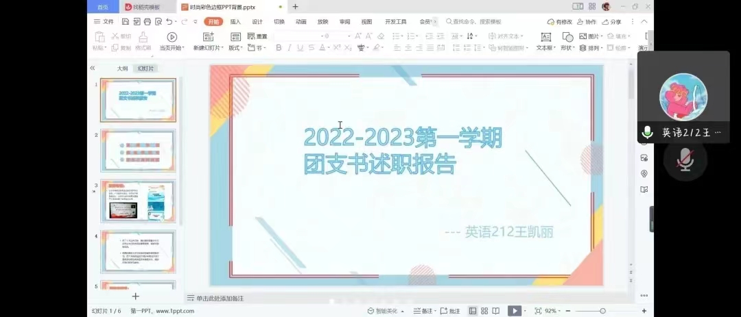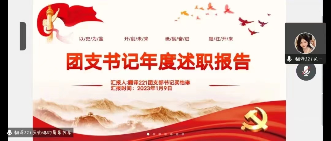 为进一步落实从严治团,提高团支部的工作质量,切实做好团干部队伍建设,外国语学院团支部于1月9日上午10:00在腾讯会议平台召开线上团总支述职会议。本次会议由宣传部副部长马鑫主持,外国语学院团总支副书记刘淑娜与20、21、22级各班团支书参会。