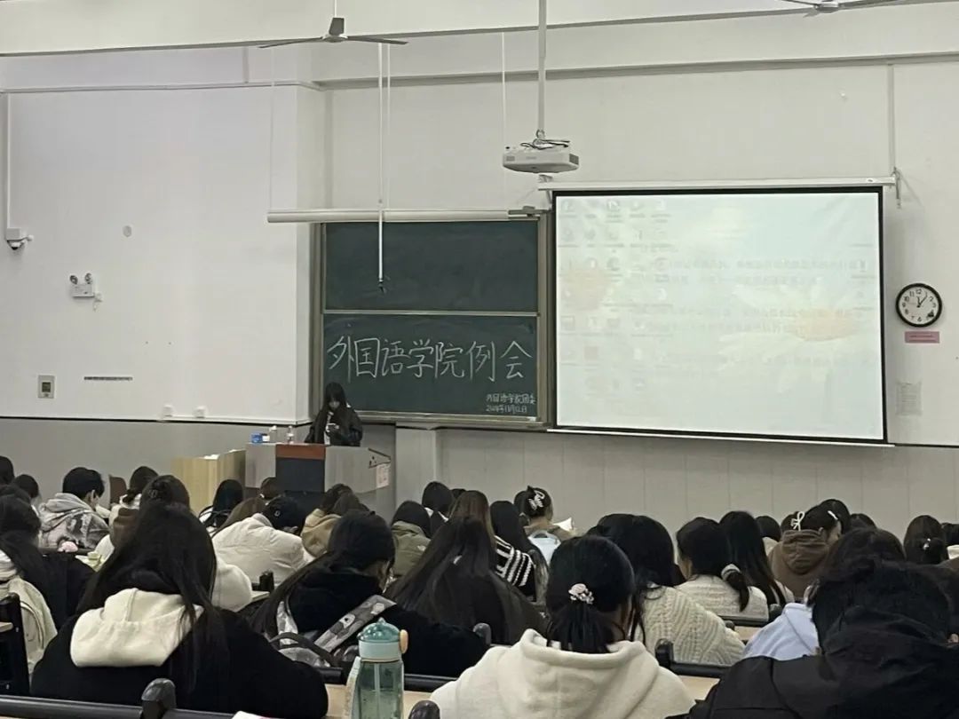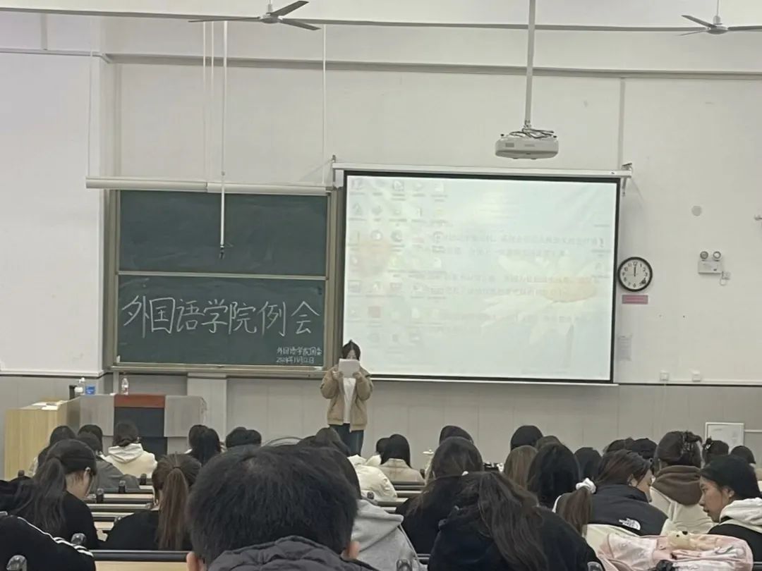 为进一步推进学生会工作,持续强化学生的自我管理能力,外国语学院学生会于11月12日中午12:00在教学楼1-110和树人楼225教室召开本学期第十一周例会。本次例会由学生会副主席郭乐主持,大一至大三各班班长、团支书、学生会及助理团全体成员参会。