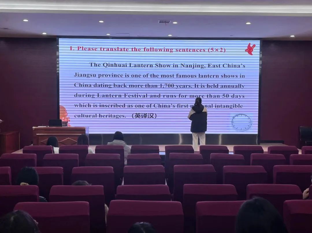 比赛伊始,主持人就参与此次翻译比赛的评委、比赛流程以及评分标准分别进行了介绍。在比赛过程中,七位选手们依次出场随机抽题,有热词翻译、汉译英、英译汉等四种题型,在规定时间内对文化热词、中文及英文原文进行准确翻译,这不仅考验了选手的临场反应能力和文化素养,同时也是对选手词汇量的检验。在整场比赛中,选手们沉着冷静,积极思考,赢得了评委老师们的赞扬。最后,本次大赛在观众和评委老师的热烈掌声中圆满结束。