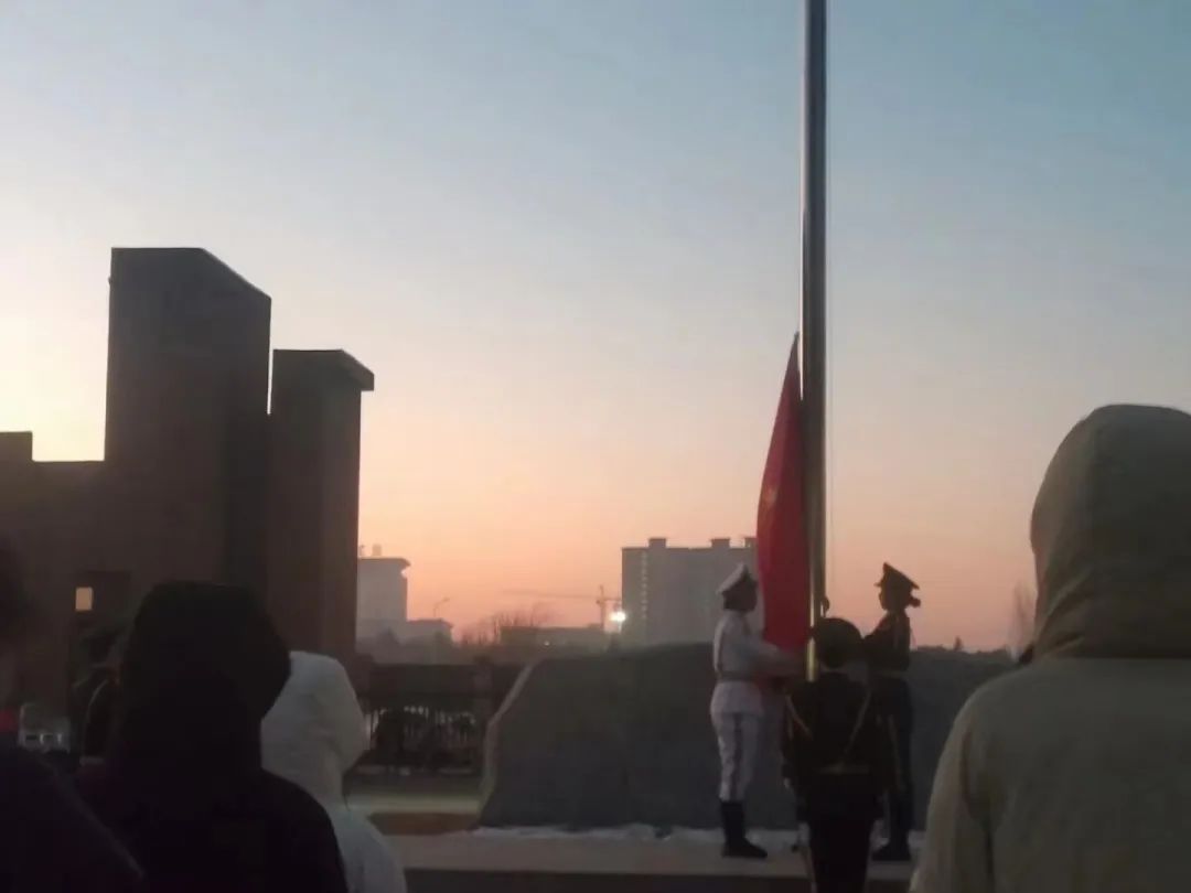 晨光破雾出,冬日暖阳来。在国旗台前,师生们肃然静立,列阵以待,满怀着敬畏与崇敬。国旗护卫队的旗手们身姿挺拔、目光坚定,迈着整齐的步伐缓缓走向升旗台。伴随着庄严的《义勇军进行曲》,五星红旗冉冉升起,迎风飘扬,在场的每一个人向国旗行注目礼,深怀对祖国无限的热爱和崇高的敬意。