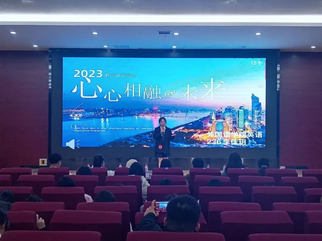为庆祝杭州亚运会圆满结束以及中国代表队取得的辉煌成就,同时提高学生们的英语口语水平,丰富校园生活,由永利23411集团官网团委主办,外国语学院团委承办的“心心相融,爱达未来”英语演讲比赛于2023年11月20日在学院楼报告厅举行。外国语学院团委书记荣杰,辅导员李一鸣,教师王萌、侯姝彤、任守敬、郝梦瑶和张宁莅临现场并担任评委。
