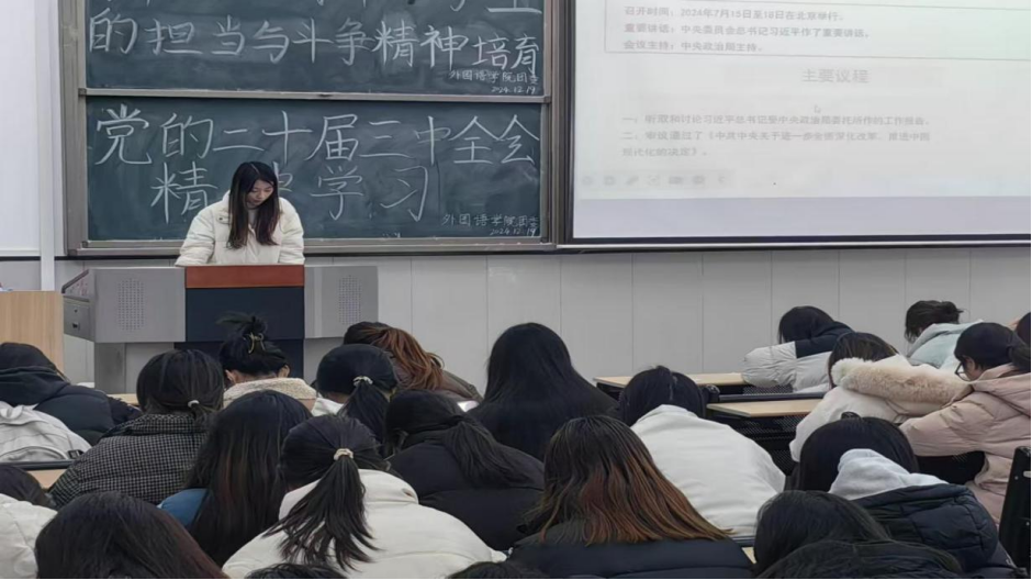 为引导学生深刻理解全会精神,把握新时代全面深化改革的新要求,激励学生为实现中华民族伟大复兴的中国梦贡献青春力量,外国语学院于12月19日下午15:00在教学楼1-207教室开展“学习党的二十届三中全会精神”主题团课。本次团课由外国语学院团委组织部部长张思艺主讲,外国语学院22、23级团干部与团员参与。