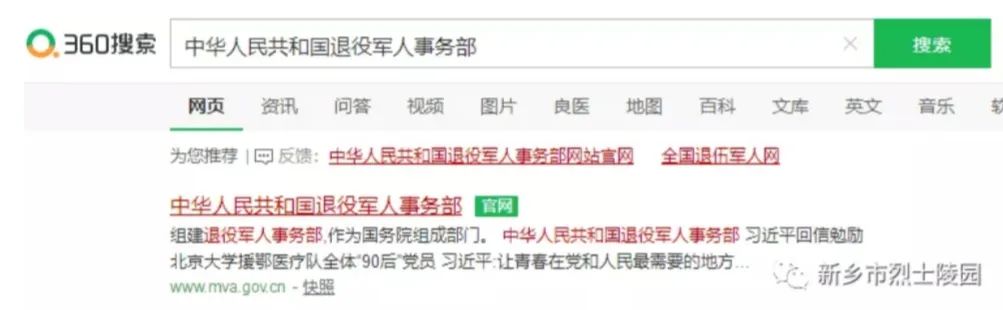 第一步:打开浏览器,输入“中华人民共和国退役军人事务部”或“中华英烈网”点击搜索。(以中华人民共和国退役军人事务部官网为例)。