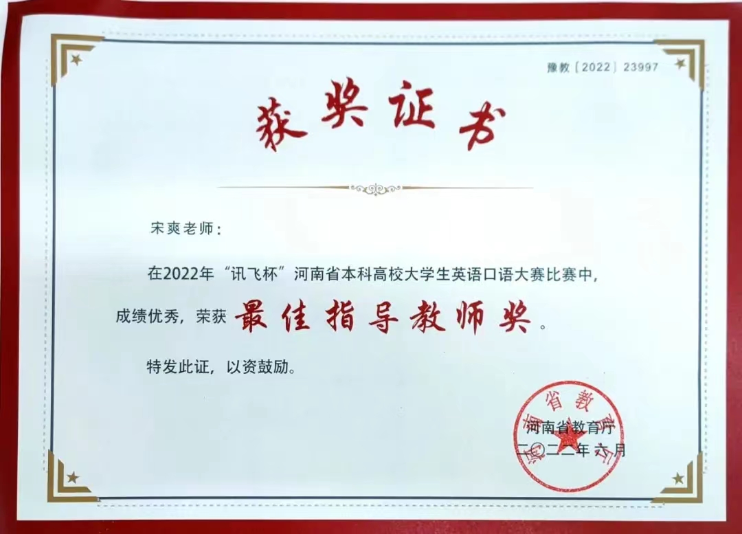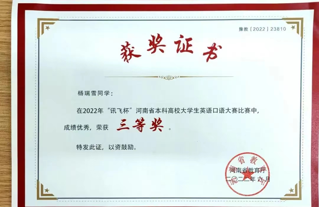 根据河南省教育厅《关于进一步推进普通本科高等学校智慧教学的实施意见》(教高〔2020〕444号) 有关要求,河南省教育厅于5月7日组织开展“讯飞杯”河南省本科高校大学生英语口语大赛,经线上初赛复赛、AI智能评分、评审,我院师生在此次比赛中喜获佳绩。