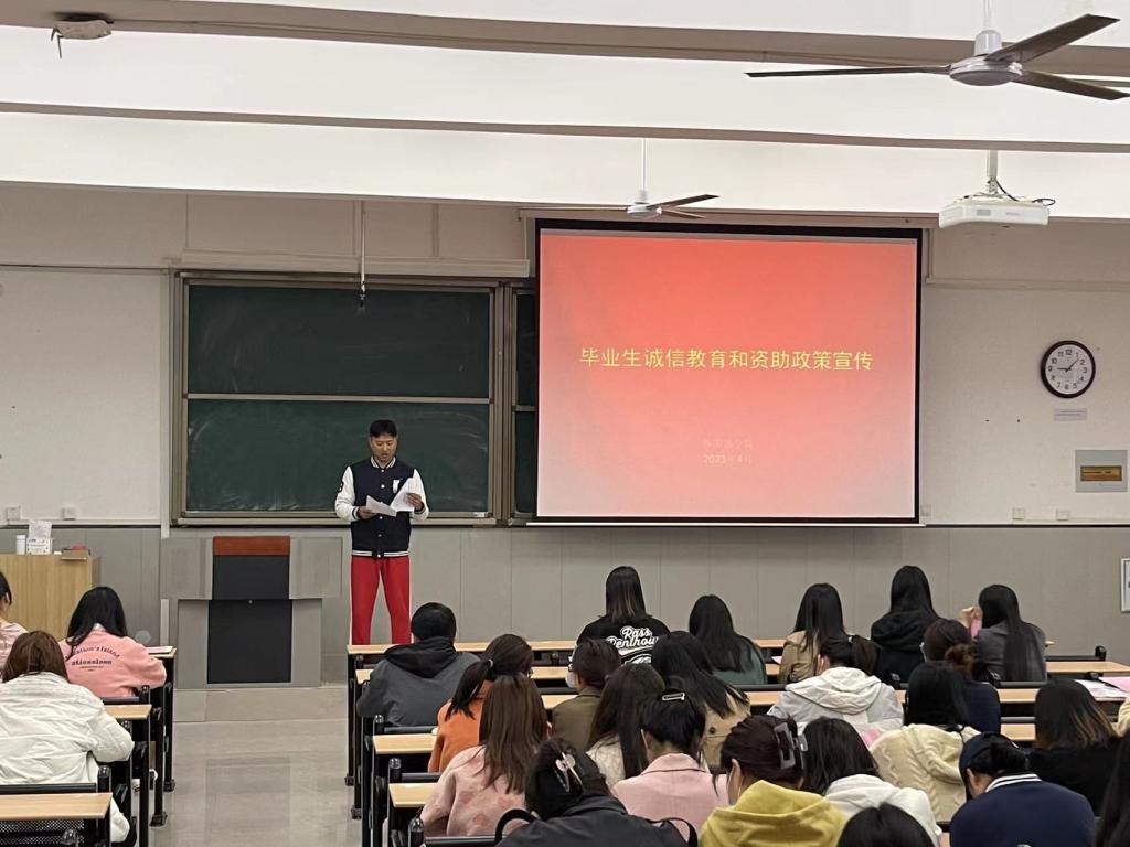 为进一步做好资助政策宣传工作,着力提升资助育人实效,增强2023届毕业生的信用意识,促进我院学生成长成才,4月25日上午9:00,外国语学院在教学楼1-209教室开展2023届毕业生诚信教育暨资助政策宣讲。本次讲座由外国语学院2019级辅导员荣杰主讲,2023届全体毕业生参与讲座。