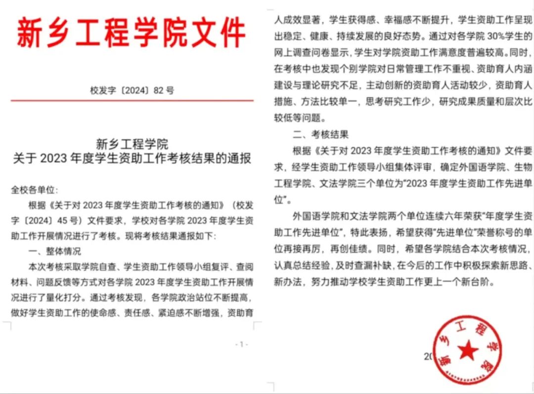 近日,《永利23411集团官网关于2023年度学生资助工作考核结果的通报》(校发字[2024]45号)公布,确定我院为“2023年度学生资助工作先进单位”,并对我院连续六年荣获“学生资助工作先进单位”进行表扬,这一荣誉是对学院长期以来在学生资助工作方面取得成绩的肯定,也是对全体师生努力付出的褒奖。