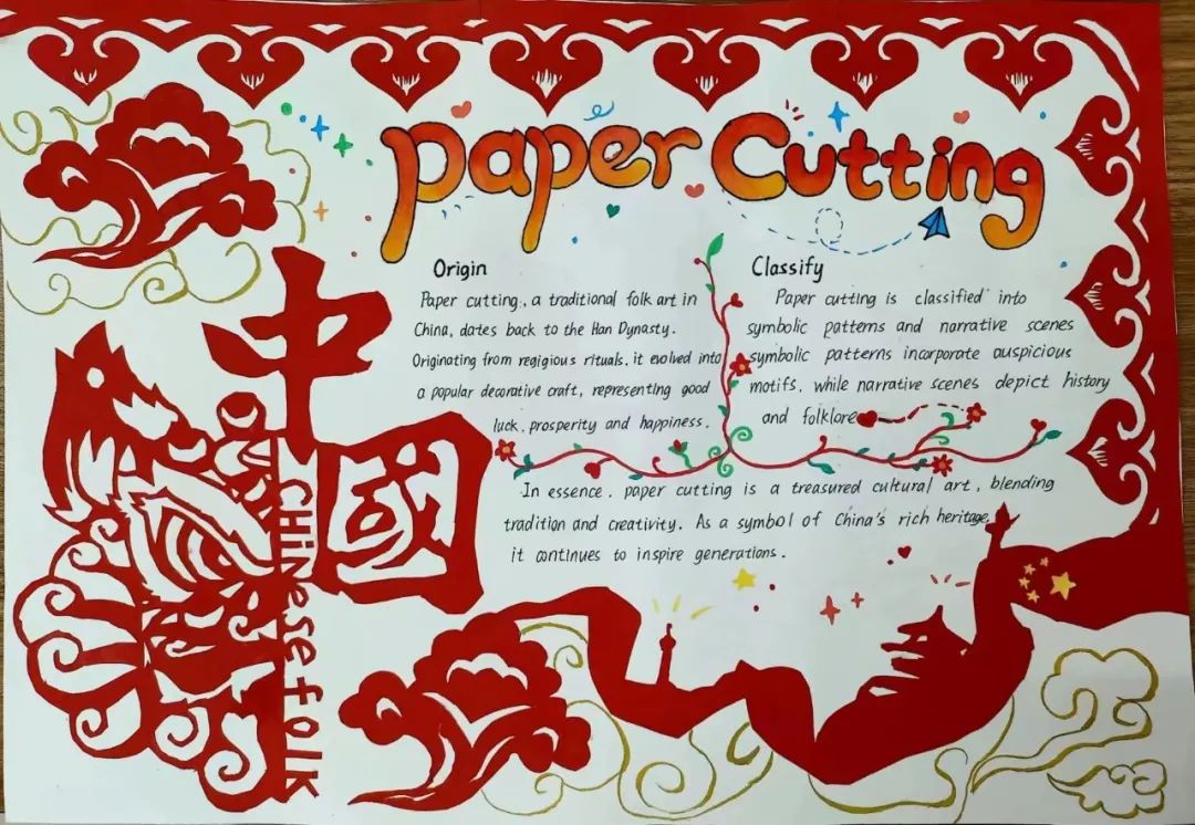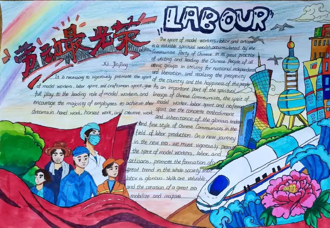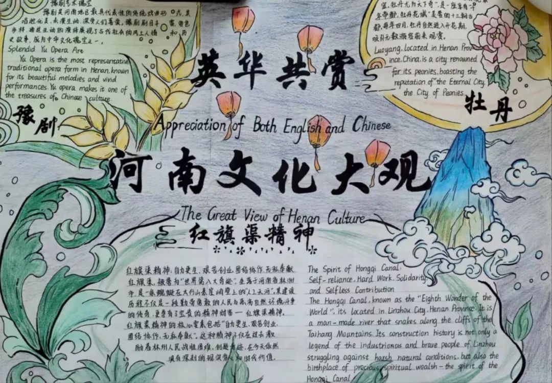 活动期间,同学们表现出极高的积极性,广泛搜集相关素材,将灵感化作文字,用手中的画笔将传统文化以具象化的形式展现出来,恰当而有创意地配上相应的插图、剪纸,形式巧妙地勾勒出一幅幅生动精美的手抄报,一描一绘中,一笔一画里散发着文化的韵味,表达了对河南风采的理解与感悟。我院高度重视此次活动,并邀请了约二十余名英语专业教师从版面设计、主题突出、色彩搭配、英文运用等方面进行了综合评价与打分,最终评选出一等奖两名,其中作品《英华共赏河南文化大观》用美观的线条和精湛的英语文字生动介绍了红旗渠精神,阐释了豫剧、牡丹等河南传统文化元素;《劳动最光荣》搭配和谐的色彩与丰富的内容,传达了新时代伟大的劳动精神。二等奖paper-cutting等作品共6名,以及三等奖《中国戏曲》等作品12名。