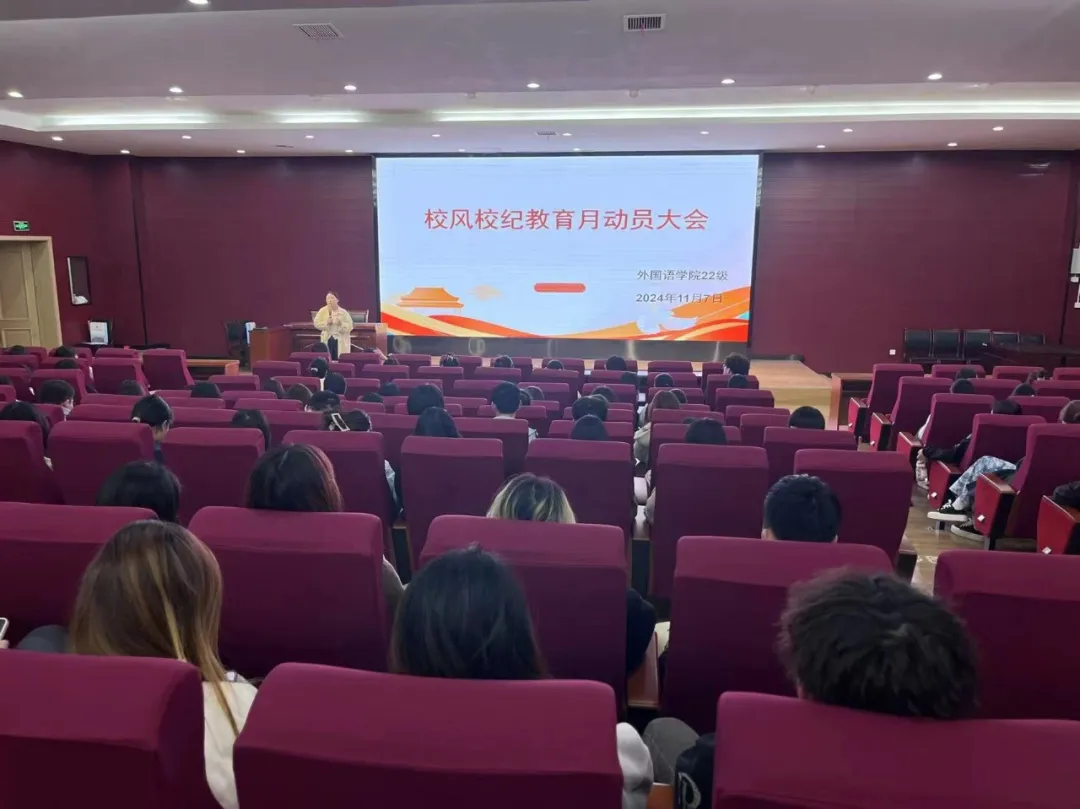 为深入学习和贯彻党的二十届三中全会精神和习近平总书记在全国教育大会上的精神,落实立德树人的根本任务,进一步加强我校学生思想教育和行为管理,引导学生更加清晰地确立学习目标,端正学习态度,强化学习纪律,规范文明行为,11月7日,外国语学院各年级组织召开校风校纪动员会,本次会议由各年级辅导员主持召开,外国语学院全体学生参加。