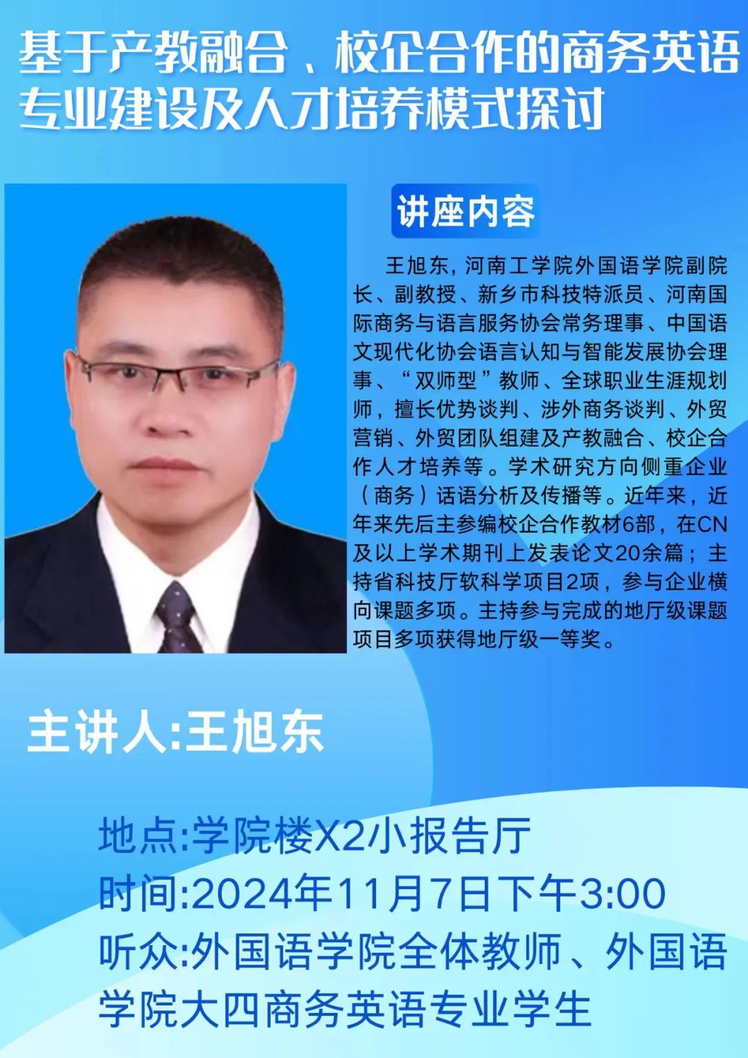 名师讲座预告:基于产教融合、校企合作的商务英语专业建设及人才培养模式探讨,欢迎广大师生前来聆听!