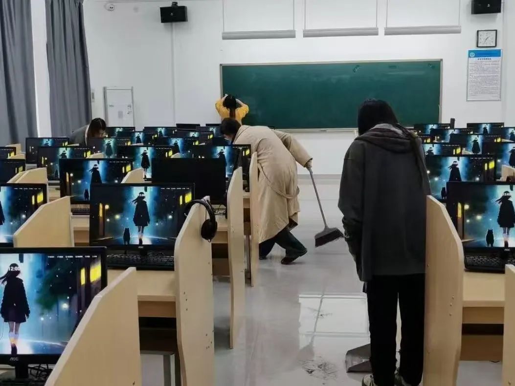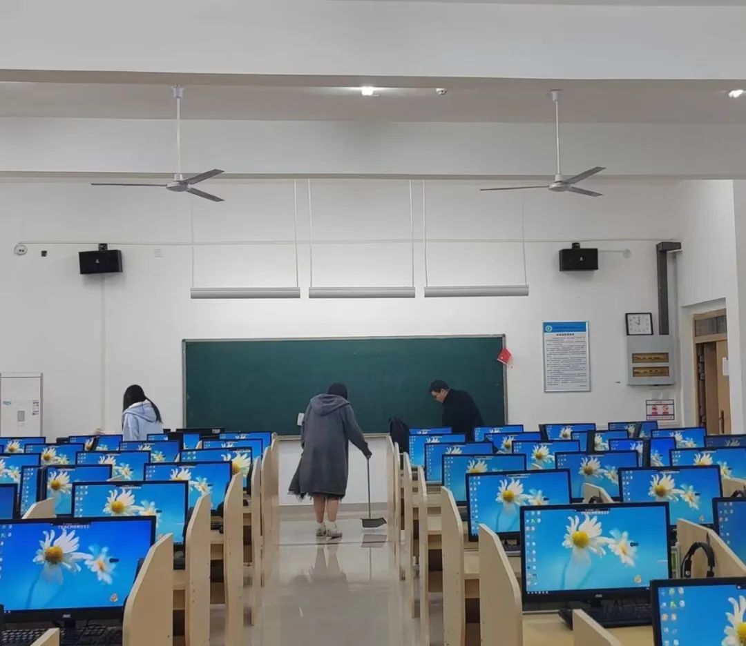 志愿者们被分为多个小组,在负责人的精心组织下,他们有条不紊地投入到语音室的全面清理工作中。志愿者们分工明确,他们不仅将凳子摆放整齐,还细心地用拖把拖净地面,随着时间的推移,教室的每一个角落都被志愿者们精心打扫过,整个教室在他们的努力下变得焕然一新,空气中弥漫着清新与洁净的气息,让人心情愉悦。