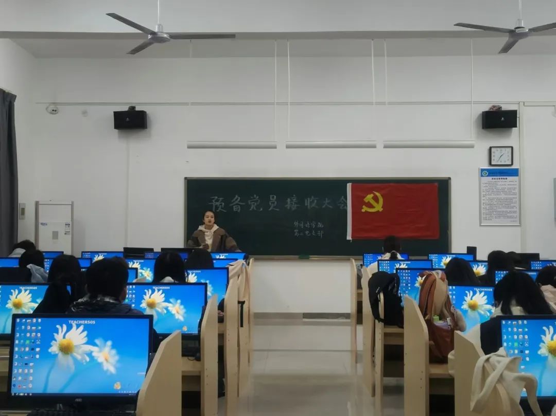 11月22日,外国语学院第二党支部于第二教学楼语音室3召开预备党员接收大会,此次会议由党支部书记范嘉欣主持,第二党支部全体党员与会。