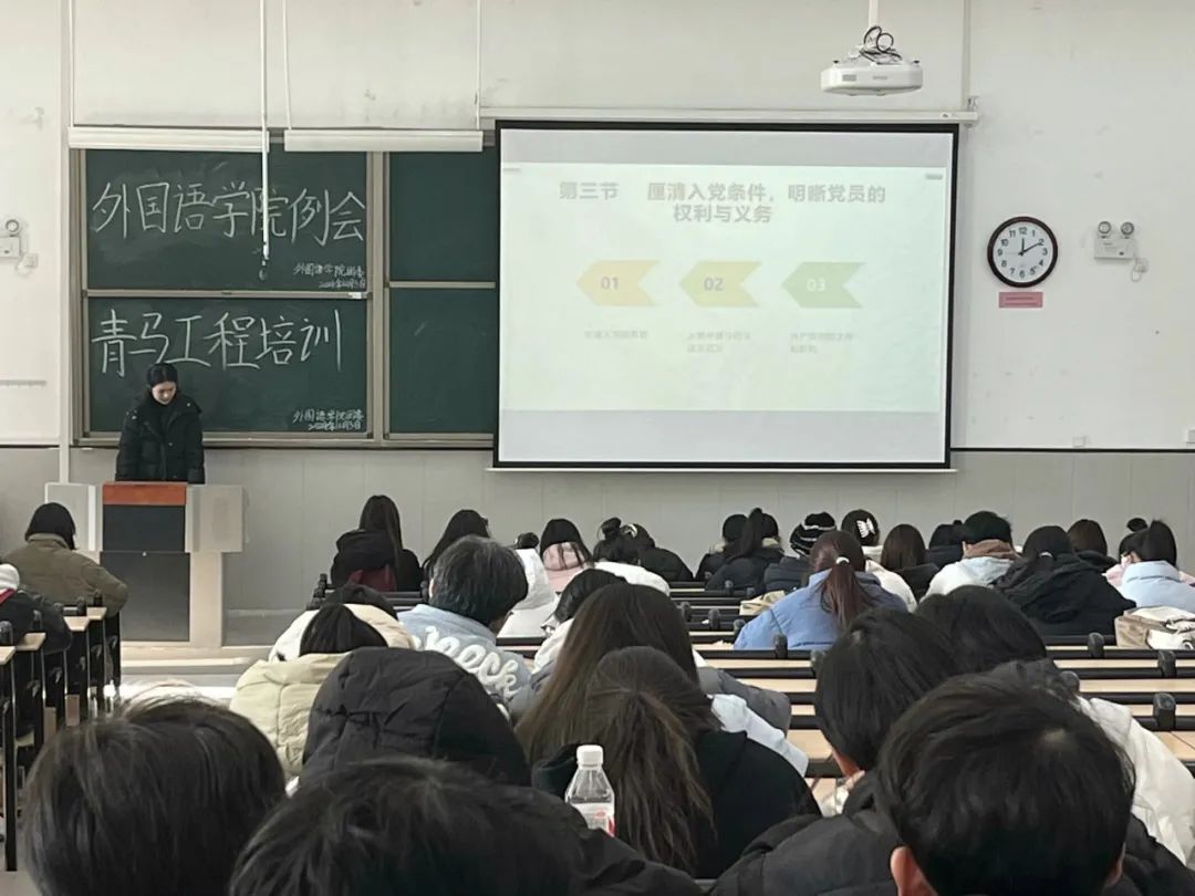 为进一步加强思想政治教育,明确共产党员的权利与义务,增强新时代共青团的凝聚力,外国语学院于12月3日中午12:00在教学楼1-109教室开展青马工程培训。本次培训由外国语学院团委副书记张果主讲,大一至大三各班班长、团支书、学生会及助理团全体成员参会。