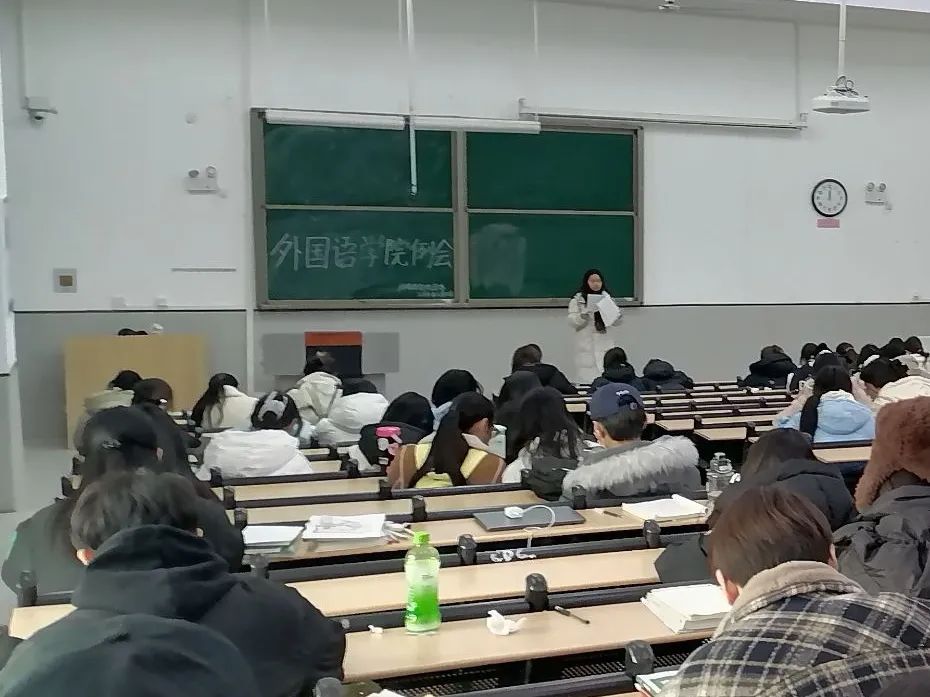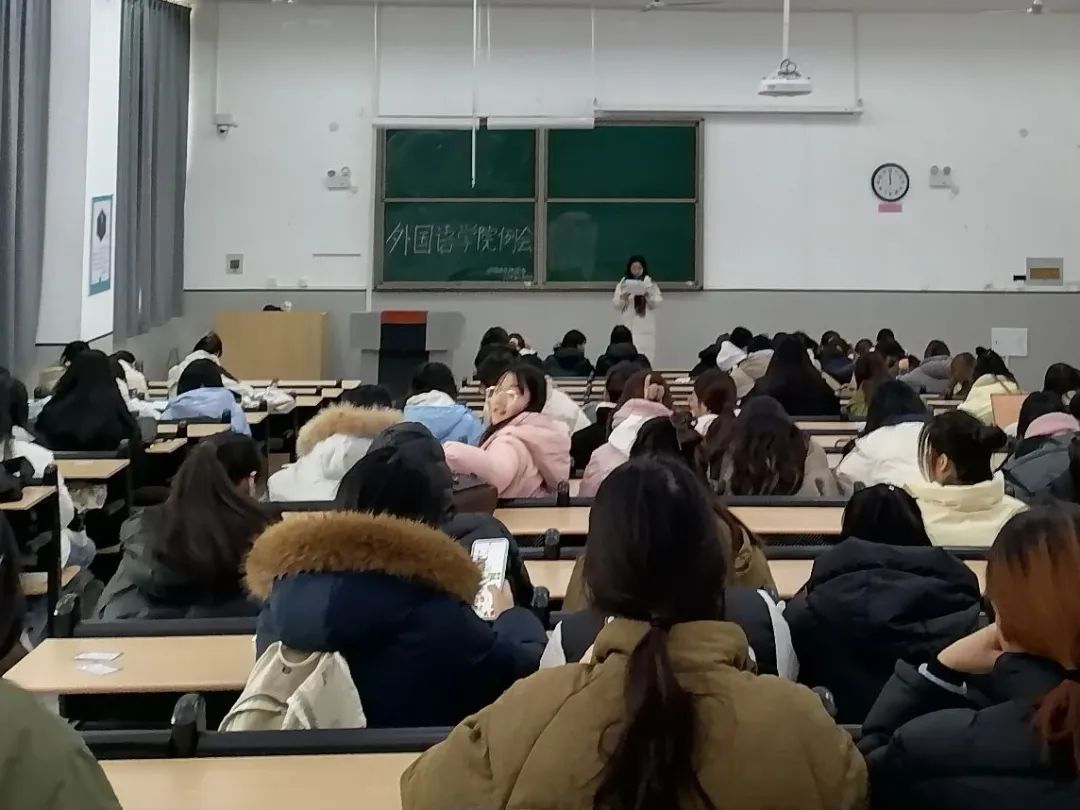 为明确期末工作重心,推进期末各项工作的开展,外国语学院学生会于12月10日中午12:00在教学楼1-109教室和树人楼-225教室召开本学期第十五周例会,本次例会由学生会副主席李紫帆主持,大一至大三各班班长、团支书、学生会及助理团全体成员参加。