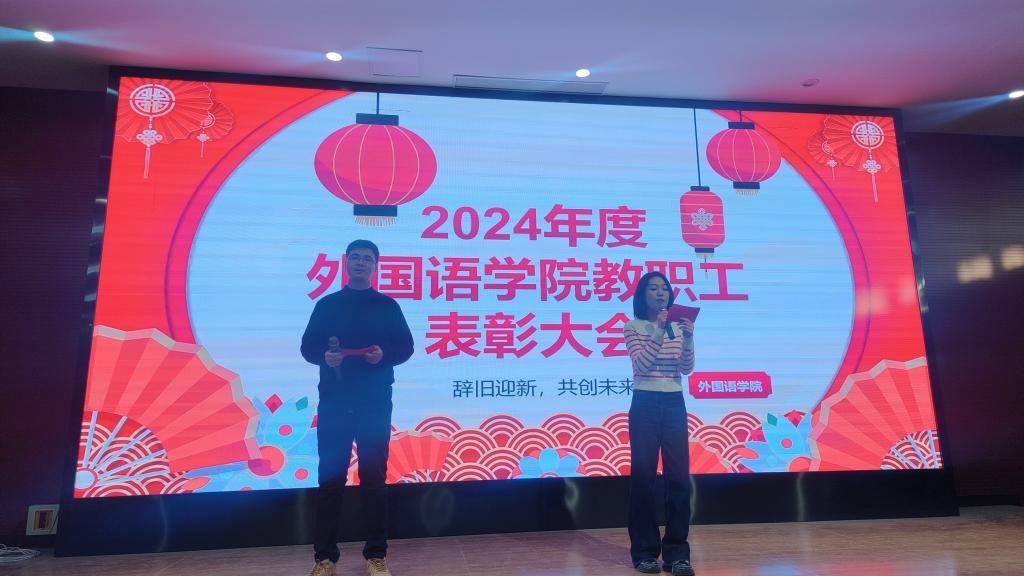 为表彰教职工在各个领域的突出贡献,激励全体教职工在新的一年继续保持工作热情,外国语学院于2024年12月27日下午在学院楼报告厅召开2024年度外国语学院教职工表彰大会,全体教师齐聚一堂,开启此次盛会。