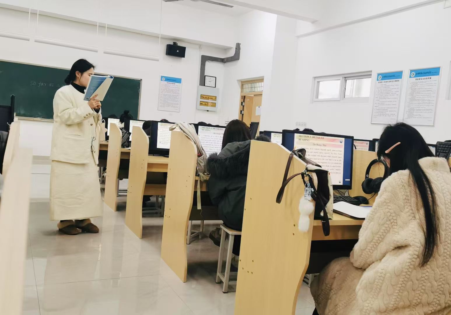 本次查课小组由学院领导、辅导员以及教学管理老师组成,重点对同学们到课情况、课堂纪律以及任课教师上课情况等方面进行检查统计。查课过程中,查课小组详细统计各班同学的出勤状况、上课状态、课堂纪律和氛围等。外国语学院整体教学秩序井然,各项教学工作有序推进。授课老师们精神饱满,以清晰的思路、生动的方式开展教学,与学生积极互动。同学们能按时抵达教室,提前做好上课准备,课堂上认真听讲,积极与教师互动,展现出良好的精神风貌和学习态度,师生互动良好,课堂教学氛围浓厚。