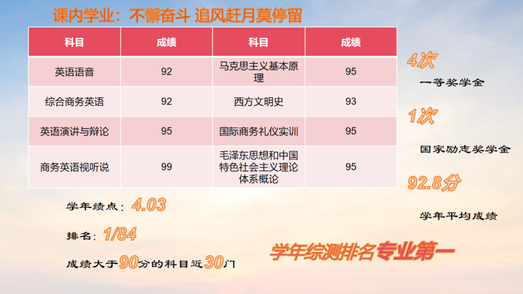 自入校以来,该生始终把学习作为大学最根本的事情,该生近一学年平均绩点4.03,综合成绩排名1/84。该生在校期间成绩大于90分的课程近30门,连续两学年综合成绩排名名列前茅。