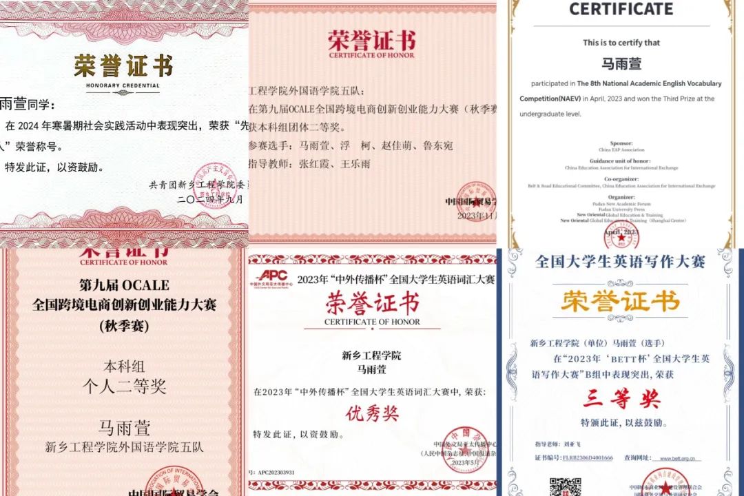 该生积极参加各类竞赛,深知“纸上得来终觉浅,绝知此事要躬行”,知识要从实践中深化理解。该生在2023年“中外传播杯”全国大学生英语词汇大赛获优秀奖;在2023年“BETT杯”全国大学生英语写作大赛荣获三等奖;在第八届全国学术英语词汇大赛荣获三等奖;在第九届OCALE全国跨境电商创新创业能力大赛团队赛二等奖;第九届OCALE全国跨境电商创新创业能力大赛个人赛二等奖;“外研社 国才杯”“理解当代中国”全国大学生外语能力大赛校级二等奖;参与项目在市级社科联项目中立项。