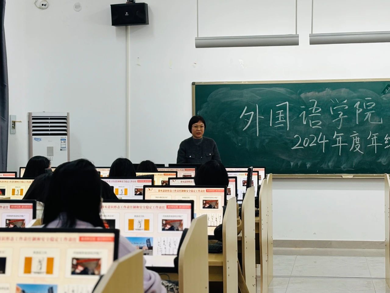 3月20日,外国语学院在第二教学楼语音室3召开2024年度年终考核汇报会。学院院长梁晓冬、副院长张帆、党委副书记王伟及全体教职工参会。会议由梁晓冬主持,全面总结年度工作成效,谋划新阶段发展路径。