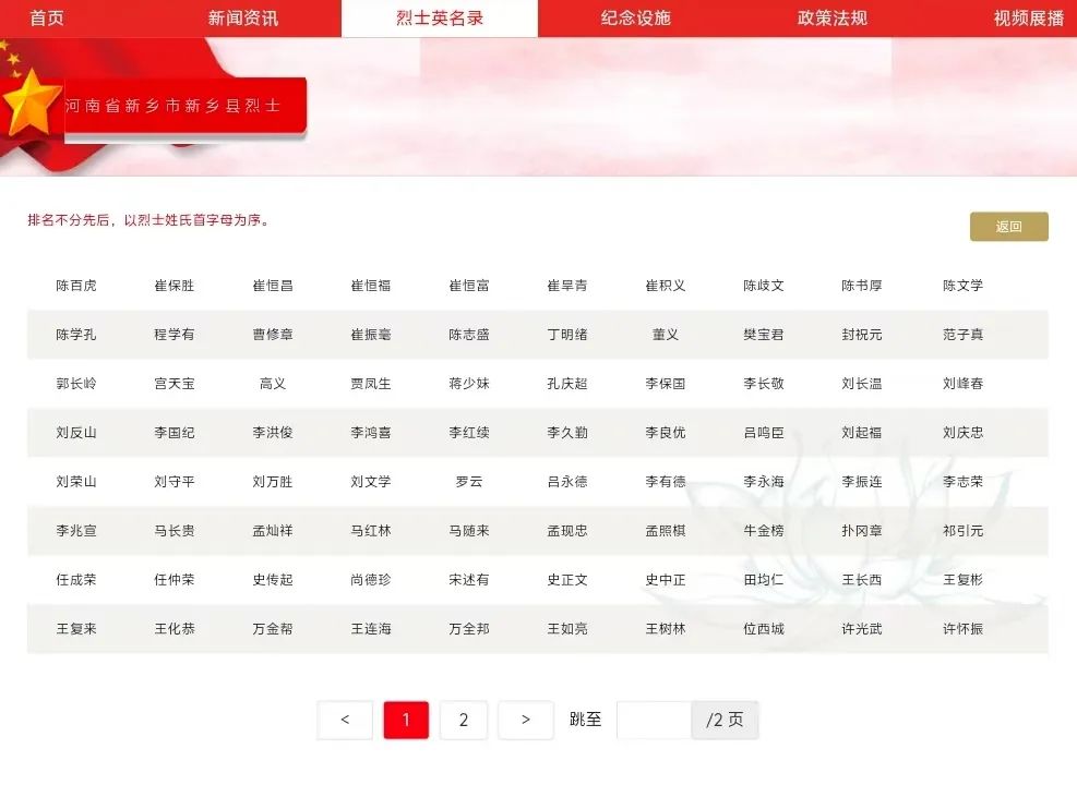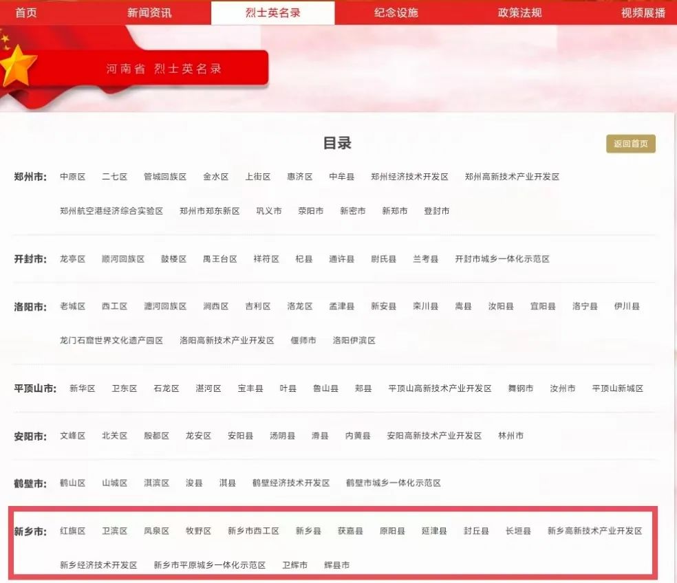 3、出现地区烈士英名录;下拉找到河南省烈士英名录,单击出现新乡市及各县区名称