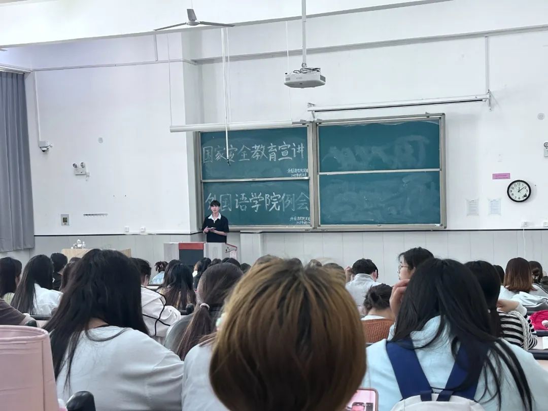 为提高在校大学生国家安全意识,筑牢校园安全防线,外国语学院于4月22日中午12:00分别在教学楼1-110和树人楼225开展国家安全教育宣讲。