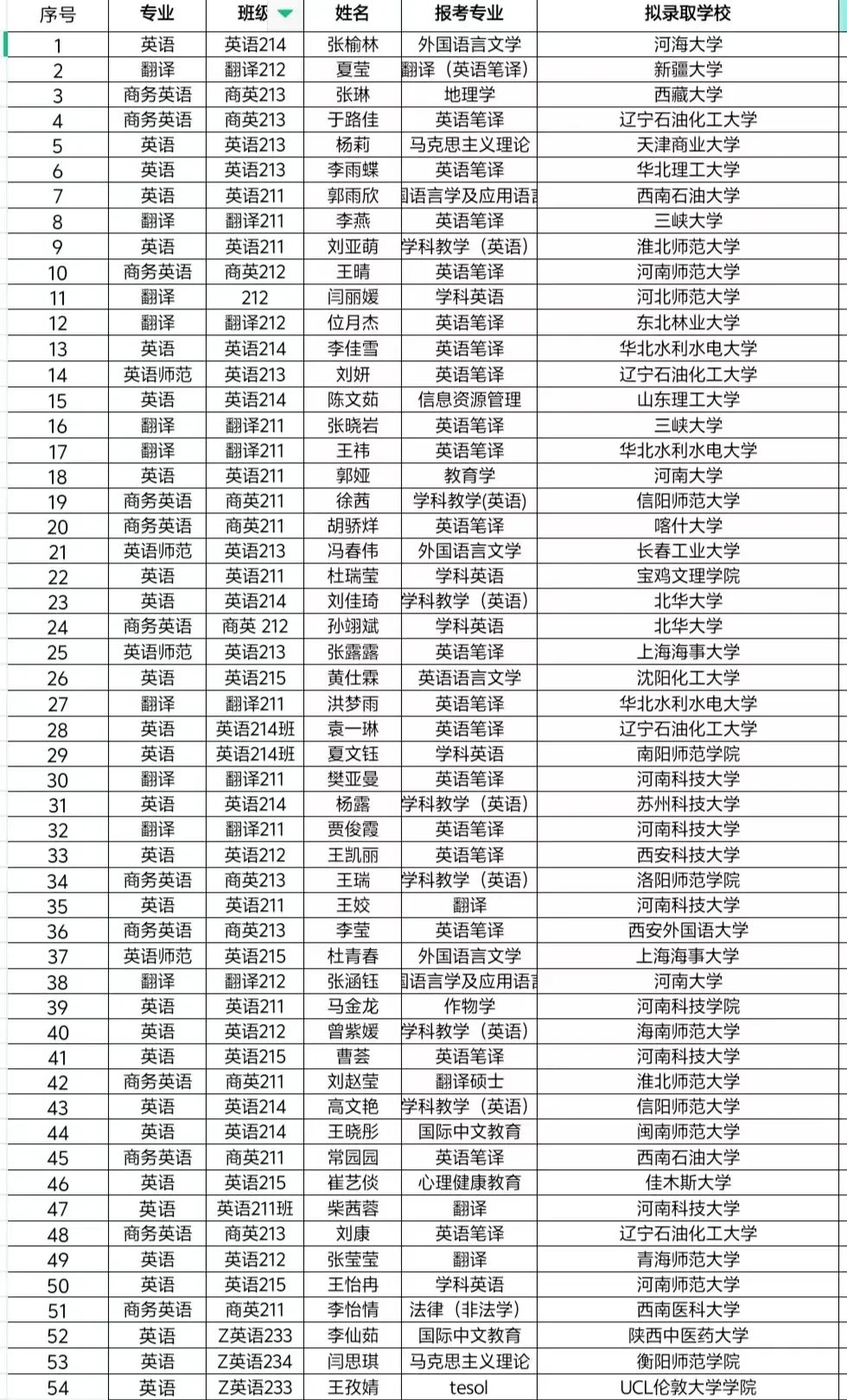 在拟录取学校方面,同学们成功考入河海大学、新疆大学、河南大学、UCL伦敦大学学院等知名高校。其中,不乏考入 211、双一流院校的优秀学子,如张榆林同学被 211 高校河海大学的外国语言文学专业录取;夏莹同学被 211、双一流高校新疆大学的翻译(英语笔译)专业录取;郭雨欣同学被双一流高校西南石油大学的外国语言学及应用语言学专业录取;位月杰同学被211、双一流高校东北林业大学的英语笔译专业录取等。